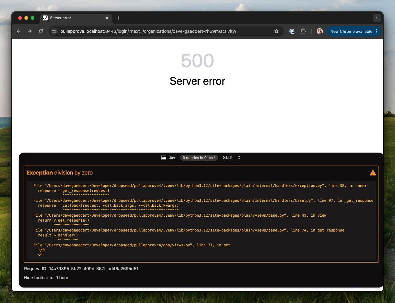 The admin toolbar also shows detail for exceptions! I like the direction this is headed compared to doing a full-blown error page, because I still want to know and remember what the end-user sees in these situations.